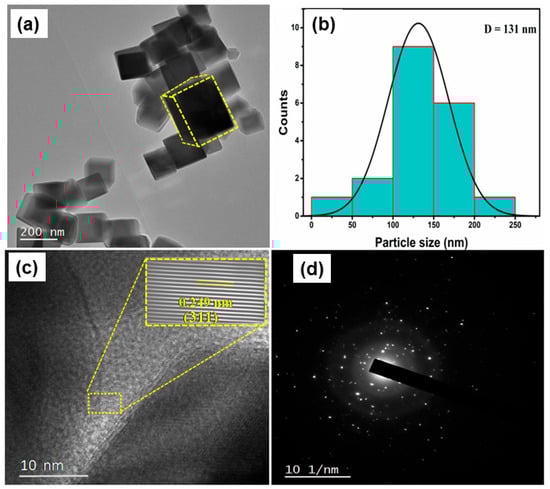 HR-TEM analysis of 1 mol% La-doped Co3O4 nanocubes: (a) TEM image, (b) histogram of particle size distribution, (c) HR-TEM lattice fringe image, and (d) SAED pattern.