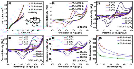 Figure 7a shows the Nyquist plots of the La-doped Co3O4 electrodes. Each spectrum features a high-frequency intercept on the real axis, a depressed semicircle in the medium-frequency region, and an inclined line in the low-frequency region. The intercept corresponds to the solution resistance (Rs = 0.24 Ω), which reflects the combined effects of electrolyte, electrode, and contact resistances. The diameter of the semicircle represents the charge-transfer resistance (Rct) at the electrode/electrolyte interface. At the same time, the inclined line is associated with Warburg impedance, arising from ion diffusion processes within the porous electrode [55]. Among the samples, the 1% La-doped Co3O4 electrode shows the smallest semicircle diameter, indicating the lowest Rct (2.2 Ω) and the most efficient charge-transfer kinetics. This improvement arises from enhanced conductivity and better electronic interactions at low La doping. However, higher doping levels (3% and 5%) increase Rct, likely due to structural distortions or blockage of electroactive sites caused by excess La incorporation. The inset equivalent circuit model (Rs, Rct, a constant phase element Q for double-layer capacitance, and a Warburg element W) fits the experimental data well, supporting this interpretation. Overall, the EIS results confirm that 1% La doping achieves the best balance between conductivity and charge transfer, whereas higher doping concentrations degrade the electrochemical pathways. Figure 7b displays the CV profiles of the La-doped Co3O4 electrodes recorded at the scan rate of 10 mVs−1 within the potential window of 0 to 0.5 V (vs. Ag/AgCl). All electrodes show pronounced and nearly symmetric anodic and cathodic peaks, corresponding to the reversible Faradaic redox transitions of Co2+/Co3+ in an alkaline electrolyte according the following relationships [56,57]
