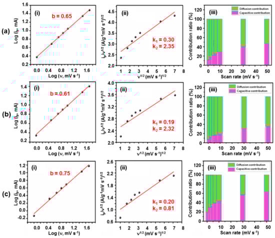 Determination of the diffusive and capacitive contributions for (a) 1%, (b) 3%, and (c) 5% La-doped Co3O4 electrodes with nanocubic morphology. (i) Plot of Log (i) vs. Log (v), (ii) plot of vs., and (iii) diffusion/capacitive contribution ratio vs. scan rate.