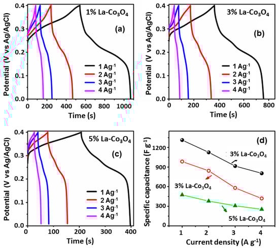 GCD curves of La-doped Co3O4 at different doping levels: (a) 1% La-, (b) 3% La-, and (c) 5% La-doped. (d) Variation in the specific capacitance with applied current densities for La-doped Co3O4 electrodes.