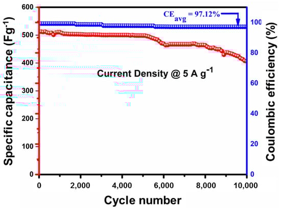 Among all electrodes, 1% La-Co3O4 exhibited the highest specific capacitances at all current densities, i.e., 1312, 1124, 915, and 804 F g−1 at current densities of 1, 2, 3, and 4 A g−1, respectively. Likewise, 3% La-Co3O4 delivered 984, 842, 579, and 420 F g−1, while 5% La-Co3O4 shows 474, 379, 308, and 253 F g−1 at the same current densities, respectively. The specific capacitance of all electrodes decreases with increasing applied current densities due to the limitation on the interaction between electrolyte ions and the electrode material at higher current densities. In addition, the cycling stability behavior of the high specific capacitance delivered sample (1%La-doped Co3O4) was recorded at 5 A g−1 for 10,000 cycles, as shown in Figure 10. It demonstrates a Coulombic efficiency of 97.12% along with 79.8% capacitance retention even after 10,000 cycles.