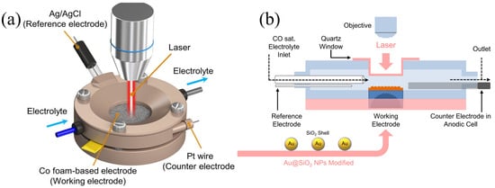 (a) In situ Raman spectroscopy apparatus. Reproduced with permission from Ref. [33]. Copyright 2022, Nature Publishing Group. (b) Schematic of the flow cell for in situ SERS test. Reproduced with permission from Ref. [34]. Copyright 2022, Nature Publishing Group.