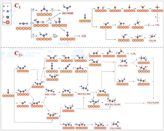CO2RR can convert CO2 into value-added chemical fuels powered by clean energy, such as renewable solar or wind energy, and is currently a promising solution to alleviate the growing greenhouse gas emissions and energy crisis [39,40,41,42]. As shown in the reaction pathway diagram in Figure 2, due to the involvement of multiple proton-coupled electron transfer (PCET) processes in the reaction, a variety of products (C1/C2+) can be generated, including carbon monoxide (CO), Methane (CH4), methanol (CH3OH), formic acid (HCOOH), ethylene (C2H4), ethanol (CH3CH2OH), Acetic Acid (CH3COOH) and many other products.