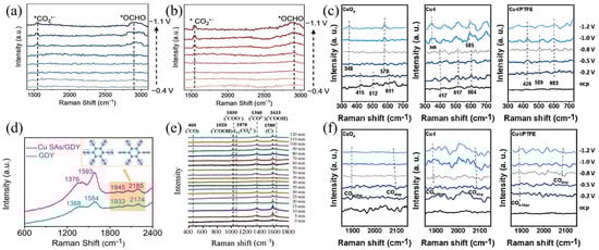 In situ Raman spectra recorded at different potentials ranging from −0.4 to −1.1 V vs. RHE for (a) pure Bi and (b) bimetallic Cu−Bi nanostructures. Reproduced with permission from Ref. [44]. Copyright 2025, Elsevier. (c) 300−730 cm−1 on CuOx, Cu−I, and Cu−I/PTFE in CO2−saturated 0.5 M KHCO3 electrolytes at various potentials. Reproduced with permission from Ref. [46]. Copyright 2023, Elsevier. (d) Raman spectra of pristine GDY and Cu SAS/GDY. Reproduced with permission from Ref. [45]. Copyright 2023, Wiley−VCH GmbH. (e) In situ Raman spectroscopy obtained from CuCoAlFeNi HEA catalyst-based H−Cell. The data was collected every 5 min. Reproduced with permission from Ref. [47]. Copyright 2025, The Royal Society of Chemistry. (f) 1850−2150 cm−1 on CuOx, Cu−I, and Cu−I/PTFE in CO2−saturated 0.5 M KHCO3 electrolytes at various potentials. Reproduced with permission from Ref. [46]. Copyright 2023, Elsevier.