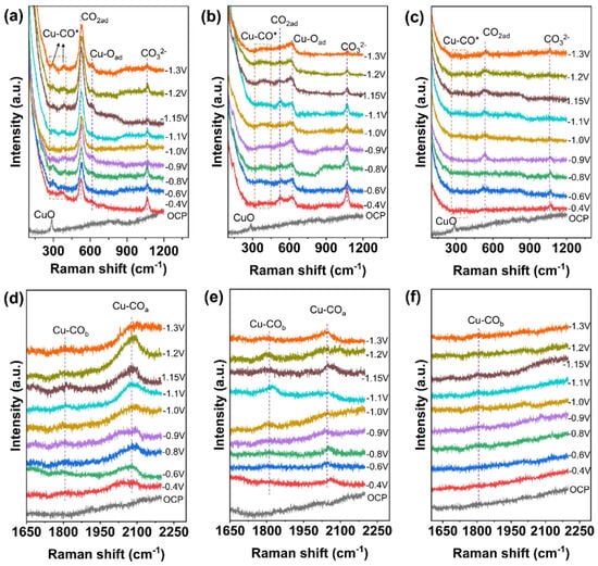 *CO has been identified as an important and common intermediate in the evolution of high-value C2+ products (such as ethylene and ethanol), particularly on Cu-based catalysts [52]. However, due to the fact that the binding of CO to the catalyst surface usually does not involve significant charge transfer, it is difficult to detect signals of CO adsorption [53,54,55,56,57]. Three characteristic vibrational modes on the surface of Cu catalysts corresponding to Raman shift regions have been observed: Cu-CO rotation mode (280–290 cm−1), Cu-C stretching vibration mode (360–370 cm−1), and C≡O stretching vibration mode (1800–2100 cm−1). Lei et al. designed grain boundary-rich Cu nanoribbons on balanced gas-liquid diffusion electrodes for efficient CO2RR conversion to C2H4. They proposed that the thickness of the catalyst layer is a factor affecting CO2 bonding; by adjusting the thickness of the catalyst layer, CO2 and electrolyte mass transfer can occur simultaneously at the catalyst surface to participate in CO2RR. Raman shifts at 302 and 368 cm−1, belonging to the rotation and stretch modes of *CO on Cu (Cu-CO), were observed, confirming the adsorption of *CO intermediates and the formation of CO. C-C coupling forms *OCCO and *OCCOH intermediates, which improve the yield of C2+ products such as C2H4 [58]. Zhang et al. developed a Cu-Zn alloy/Cu-Zn aluminate oxide composite electrocatalytic system to enhance the conversion of CO2 to C2+ products. They investigated the oxidation state of Cu via in situ Raman spectroscopy. As shown in Figure 4, CuO species exhibit a sharp peak at 285 cm−1 under open circuit voltage, and this peak disappears rapidly when the cathodic voltage is −0.4 V, indicating that surface copper oxide is almost completely reduced to Cu0 species during the CO2RR process. The Raman peak at 529 cm−1 shown in Figure 4a is associated with the chemical adsorption of *CO2 on the copper surface, becoming more intense with the application of greater negative voltages. In contrast, as shown in Figure 4b,c, the *CO2ad peak at 529 cm−1 on Cu/CuAl2O4 and CuZn surfaces decreases rapidly, indicating a low surface coverage of *CO2ad. They compared the Raman peaks at 529 cm−1 of CuZnAl2O4 samples and CuAl2O4 samples, confirming that the alloy/oxide interface significantly enhances the activation capacity of CO2. As shown in Figure 4a–c, the peaks at 297 and 375 cm−1 are attributed to the rotation and stretching modes of *CO on Cu (Cu-CO), indicating the formation of CO and the adsorption of *CO. Meanwhile, peaks in the range of 1800–1860 and 2000–2080 cm−1 observed in Figure 4d belong to *CObridge and *COatop. However, Figure 4b,e show that the Cu-CO Raman signal becomes very weak on Cu/CuAl2O4, indicating a low coverage of CO, while on the pure CuZn alloy catalyst, this signal is hardly observed (Figure 4c,f). It can thus be inferred that the enhanced CO adsorption on CuZn/CuZnAl2O4 should be attributed to the CuZnAl2O4 oxide or positively charged Cu or Zn at the interface. These data demonstrate that the CuZnAl2O4 oxide at the interface enhances the adsorption of CO2 and CO, and the two adsorption modes of *CObridge and *COatop will promote C-C coupling with lower reaction energy barriers [59]. Jiao et al. consider copper-based catalysts to be the best catalysts for CO2 reduction to hydrocarbon products. They observed using in situ Raman spectroscopy that the peaks at 1071.2 and 1013.8 cm−1 are attributed to CO32− and HCO3− on Pot-Cu catalysts, while both CO32− and HCO3− are present on Pul(3)-Cu catalysts. The Cu−OH signal observed at 529.1 cm−1 is more prominent on Pot-Cu than on Pul(3)-Cu, and leads to high peaks at 355.9−366.3, 2030.2−2054.3, and 2091.2−2103.1 cm−1, corresponding to Cu−CO stretching, *CO stretching in the low-frequency band (LFB), and *CO stretching in the high-frequency band (HFB), respectively. This indicates that the rough surface and porous structure of Pot-Cu facilitate the enrichment of OH−, significantly promoting the dimerization of *CO. It confirms that Cu catalysts with different coordination numbers (CN) exhibit different adsorption behaviors towards *CO, thereby impacting the reaction pathways of CO2RR [60].