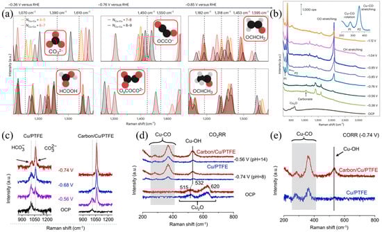 (a) DFT−optimized CO2RR reaction intermediates and their vibrational fingerprints. (b) Raman spectra of an electrochemically treated Cu foil acquired during CO2RR for potentials ranging from the open−circuit potential (OCP) to about −1.1 V vs. RHE in a CO2−saturated 0.1 M NaClO4 electrolyte. cps, counts per second. Reproduced with permission from Ref. [65]. Copyright 2024, Nature Publishing Group. (c) In situ Raman spectra obtained from Cu/PTFE (left) and carbon/Cu/PTFE (right). (d) In situ Raman spectra of Cu/PTFE (blue) and carbon/Cu/PTFE (red) during CO2RR. The region between 240 and 415 cm−1 is shaded. (e) In situ Raman spectra collected at different electrodes under CO2RR at −0.74 V. Reproduced with permission from Ref. [68]. Copyright 2023, American Chemical Society.