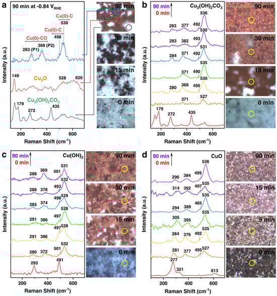 Operando Raman spectroscopy characterizations. (a) Time −resolved light microscopy (right panel) images of the Cu2(OH)2CO3 electrode surface during CO2RR at −0.84 vs. RHE, and the operando Raman spectra (left panel) acquired from three different areas (circled in different colors) on the Cu2(OH)2CO3 electrode surface after 90 min of reaction. (b) Cu2(OH)2CO3 at −0.84 vs. RHE, (c) Cu(OH)2 at −1.08 vs. RHE, and (d) CuO at −1.16 vs. RHE during CO2RR, showing time-resolved operando Raman spectra (left panel) and light microscopy images (right panel) at their optimum potentials for C2+ production. All measurements were conducted in CO2−saturated 0.1 M KHCO3 electrolyte, and Raman spectra were acquired using a 633 nm laser as the excitation source, with spectra collected every 15 min. Reproduced with permission from Ref. [76]. Copyright 2022, Nature Publishing Group.