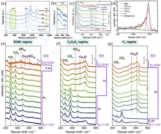 The induced kinetics of surface coverage of hydrogen (Had), hydroxide (OHad), and carbon monoxide (COad) on Cu-based catalysts are crucial for the fundamental principles of CO2RR selectivity changes. However, due to the lack of surface-sensitive operando characterization, determining whether surface Cu oxides exist still poses certain challenges [29,78,79]. Herzog et al. used TR-SERS to track the dynamic structural evolution of prereduced Cu2O nanocubes and changes in adsorbed species during the CO2RR process. Through spectral analysis under ethanol regime (EtOH mode, Figure 7e), ethylene/acetaldehyde regime (C2H4Ox mode, Figure 7f), and C1 regime (C1 mode, Figure 7g), they revealed the spatiotemporal distribution characteristics of Cu2O phases, CO adsorption configurations, and surface hydroxyl (OHad) species in different product pathways. The results show that anodic pulses promote the growth of Cu2O layers, the rate of which is significantly slower than the reduction/desorption process under cathodic pulses, and exhibits the most significant continuous growth trend under conditions for C1 products. As shown in Figure 7d, the CO Raman region at 1900–2150 cm−1 shows that the *COatop (low frequency of approximately 2065 cm−1 and a high frequency of approximately 2095 cm−1) dominate under conditions for C2+ products, whereas the *CObridge (at approximately 2030 cm−1) is significantly enhanced under conditions for C1 products, which reveals the correlation between different adsorption configurations and C–C coupling activity. OHad related bands (370–380, 520–540 cm−1) are significantly enhanced at the initial stage of anodic pulses, accompanied by peak position shifts caused by the Stark effect due to electric field changes generated by potential switching, indicating that they may act as intermediate species for Cu2O formation. These data confirm that nanocrystalline Cu2O domains can be generated at the end of anodic pulses, accompanied by a small amount of highly disordered Cu(II) species. This work systematically reveals the temporal evolution of surface redox cycles and intermediate configurations of cuprous oxide nanocubes under CO2RR conditions, providing direct spectral evidence for understanding product selectivity regulation [78].