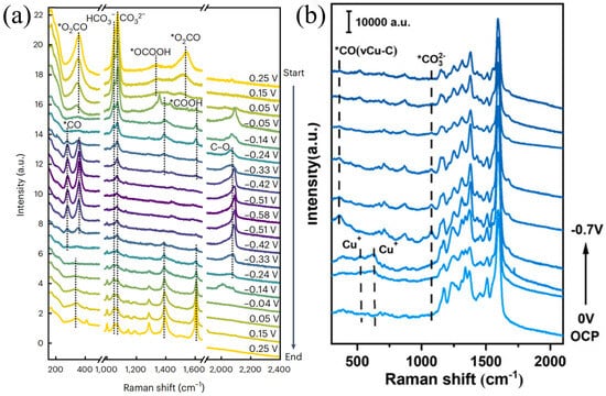 In the CO2RR process, the C≡O stretching mode of adsorbed *CO is one of the most representative characteristics in in situ Raman spectroscopy analysis, whose peak position can reflect changes in adsorption configuration and local reaction environment. Generally, the *COatop signal is located in the range of approximately 2000–2100 cm−1, while the *CObridge signal is distributed in the range of approximately 1800–1900 cm−1. However, the specific peak positions and relative intensities vary with the catalyst surface structure, potential, and reaction conditions. They used TR-SERS to study the potential-dependent spectral characteristics in more detail. The TR-SERS spectra can also be roughly divided into three parts: (1) <700 cm−1: vibrations of Cu2−xO, Cu-C, and Cu-O(H); (2) 700–1600 cm−1: carbonate/bicarbonate electrolyte ions; (3) 2000–2100 cm−1: stretching vibrations of adsorbed CO [29,30]. Ruiter et al. used TR-SERS to study the dynamic reconstruction of copper (oxide) electrode surfaces and the adsorption of reaction intermediates during cyclic voltammetry (CV) and pulse electrolysis (PE) processes. When the scan direction is reversed after reaching the maximum anodic bias of +1.0 V vs. RHE, vibrations at ~630, 520, and 400 cm−1 are observed, which belong to the Cu2-xO surface. These are partially attributed to the Raman-active modes of the Cu2-x lattice (520 cm−1, T2g) and the chemistry of defect-rich copper oxides (400 and 630 cm−1). However, pulsed electrolysis (PE) at different cathodic biases shows that stochastic CO dominates initially, while no CO intermediates are observed after long-term application at low overpotentials. When the cathodic bias is −0.55 V, it leads to the formation of statically adsorbed CO intermediates and a decrease in stochastic CO. This phenomenon reveals the reconstruction of oxide-derived copper electrodes and the formation of CO at low overpotentials [29].