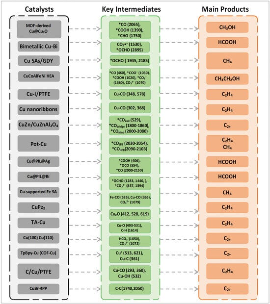 The potential kinetics study on inducing structural changes of Cu catalysts in CO2RR is of great significance for guiding catalysts to selectively generate multi-carbon products. Surface reconstruction plays an important role in the activity and selectivity of CO2RR [80,81]. Amirbeigiarab et al. used a SERS system to study the CO2RR process of Cu(100) electrodes in a CO2-saturated 0.1 M KHCO3 electrolyte. Prior to the experiment, pretreatment was performed on the copper electrode via repeated redox to ensure the complete reduction of the Cu surface, and Raman spectra were collected during the gradual application of cathodic potential. As shown in Figure 8a, there are strong Raman peaks at 360 and 1540 cm−1, corresponding to bidentate carbonate (*O2CO) adsorbed on or near the Cu(100) surface. The peaks at 1050 and 1072 cm−1 correspond to HCO3− and CO32−, respectively. The weak peak at ~1000 cm−1 may originate from dissolved bicarbonate or adsorbates related to formic acid/formate. They also pointed out that the weakening of the peaks at 360 and 1540 cm−1 may also be related to the reduction process of oxides such as CuCO3. In the potential scan, as the potential decreases from 0.25 V to −0.05 V, the original carbonate peaks at 360 and 1540 cm−1 gradually weaken, and new peaks at 1390 and 1610 cm−1 appear at −0.05 V, which correspond to the symmetric and asymmetric vibrations of adsorbed carboxylate ions or carboxyl groups, respectively. These species are considered precursor intermediates of *CO in the CO2RR process. When the potential drops below −0.33 V, these carboxylate-related peaks disappear, indicating that their formation has a certain potential dependence. Meanwhile, both high wavenumber (CO atop, ~2090–2100 cm−1) and low wavenumber (CO bridge, ~2030 cm−1) regions appear, showing a reversible conversion trend: under low overpotential, bridge-bonded CO with low coverage dominates, while under high overpotential, it gradually converts to atop CO structures with high coverage and higher activity. In addition, below −0.04 V, a broad peak appears at 2900 cm−1 in the Raman spectrum, attributed to the C–H stretching vibration mode, which is related to the formation process of carboxylates; this peak remains in the positive potential scan, indicating that some intermediates have irreversible adsorption on the surface. It reveals the key adsorbed species and their conversion pathways on the Cu(100) surface during CO2RR, indicating that the configuration transition of *CO is closely related to C–C coupling activity, and some carboxylate intermediates have strong surface stability in the reaction [80]. Yu et al. utilized the nitrogen-containing functional groups of COF-TpBpy to design a Cu-COF catalyst (Tp represents 2,4,6-triformylphloroglucinol; Bpy represents [2,2′-bipyridine]-5,5′-diamine) coordinated with copper acetate, and conducted in situ Raman analysis, obtaining the evolution of TpBpy-Cu catalyst and the progress of CO2RR (Figure 8b). The overpotential of Cu+ at 513 and 621 cm−1 is relatively low; Cu2+ is reduced to Cu+, and as the potential shifts to more negative values, the corresponding peaks of Cu+ disappear, with Cu+ further reduced to Cu0. Meanwhile, a Cu-C stretching vibration appears for Cu-adsorbed CO at 361 cm−1, confirming that the active sites are in situ generated Cu nanoparticles. It reveals the structural transformation from TpBpy-Cu to Cu nanoparticles during the CO2RR process [81]. As shown in Figure 9, Cu-based catalysts with different structures (single-atom, bimetallic, MOF-derived, etc.) can regulate the formation of key intermediates such as *CO, *COOH, Cu-CO, and *OCHO. The difference in intermediates directly determines product selectivity: *CO/*COOH-type intermediates tend to generate CH3OH. *OCHO is conducive to HCOOH. Cu-CO-type intermediates often promote C2H4 or C2+ products, and CO in different adsorbed states can lead to CH4. This demonstrates the correlation between catalyst structure, intermediates, and product selectivity, and plays a key role in achieving efficient resource-oriented conversion of CO2, as well as in carbon emission reduction and green chemical synthesis.