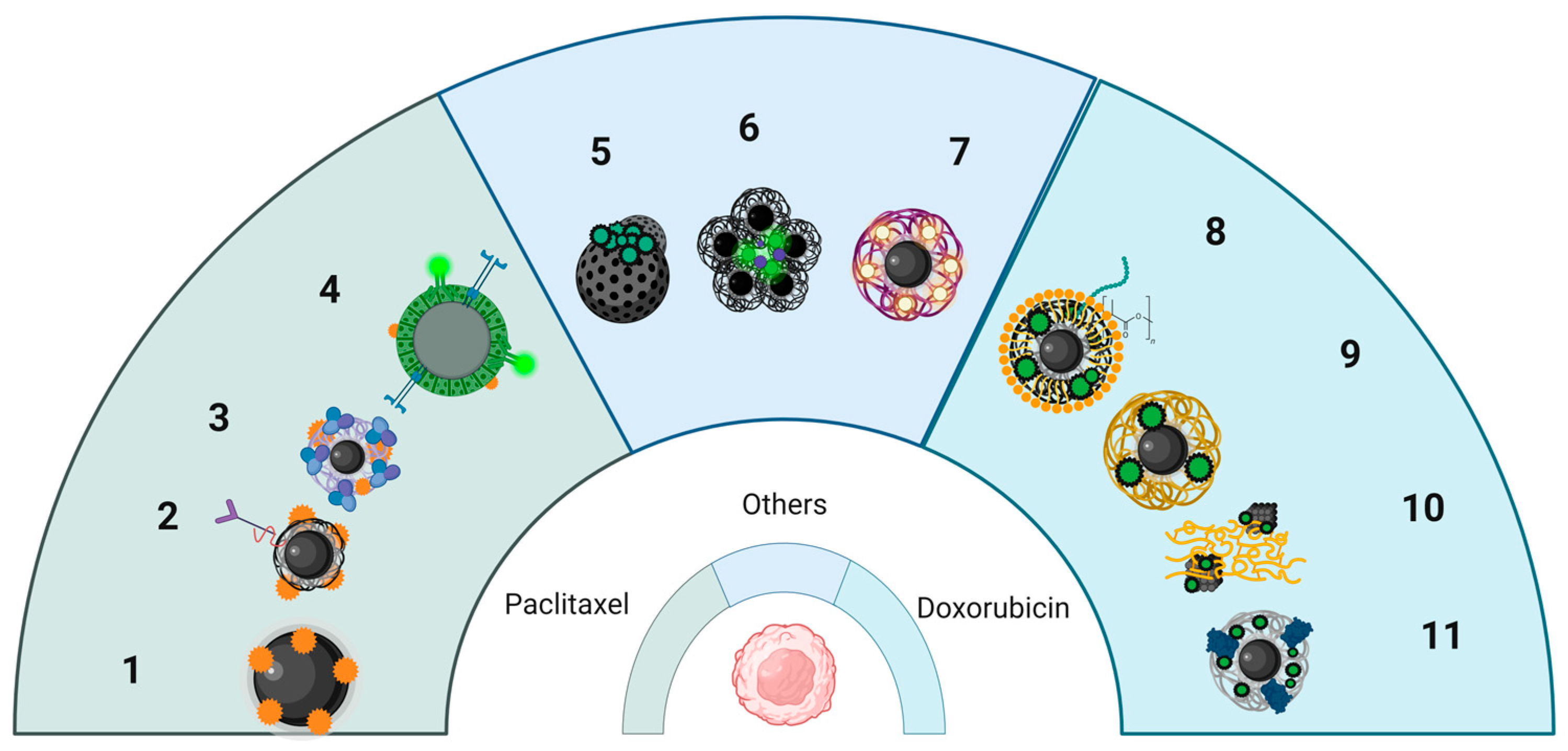 | Magnetic-core silica nanoparticles with nano valves and loaded with cucurbituril | MDA-MB-231 breast cancer cells | Targeted delivery using a nano valve system and hyperthermia [350] |