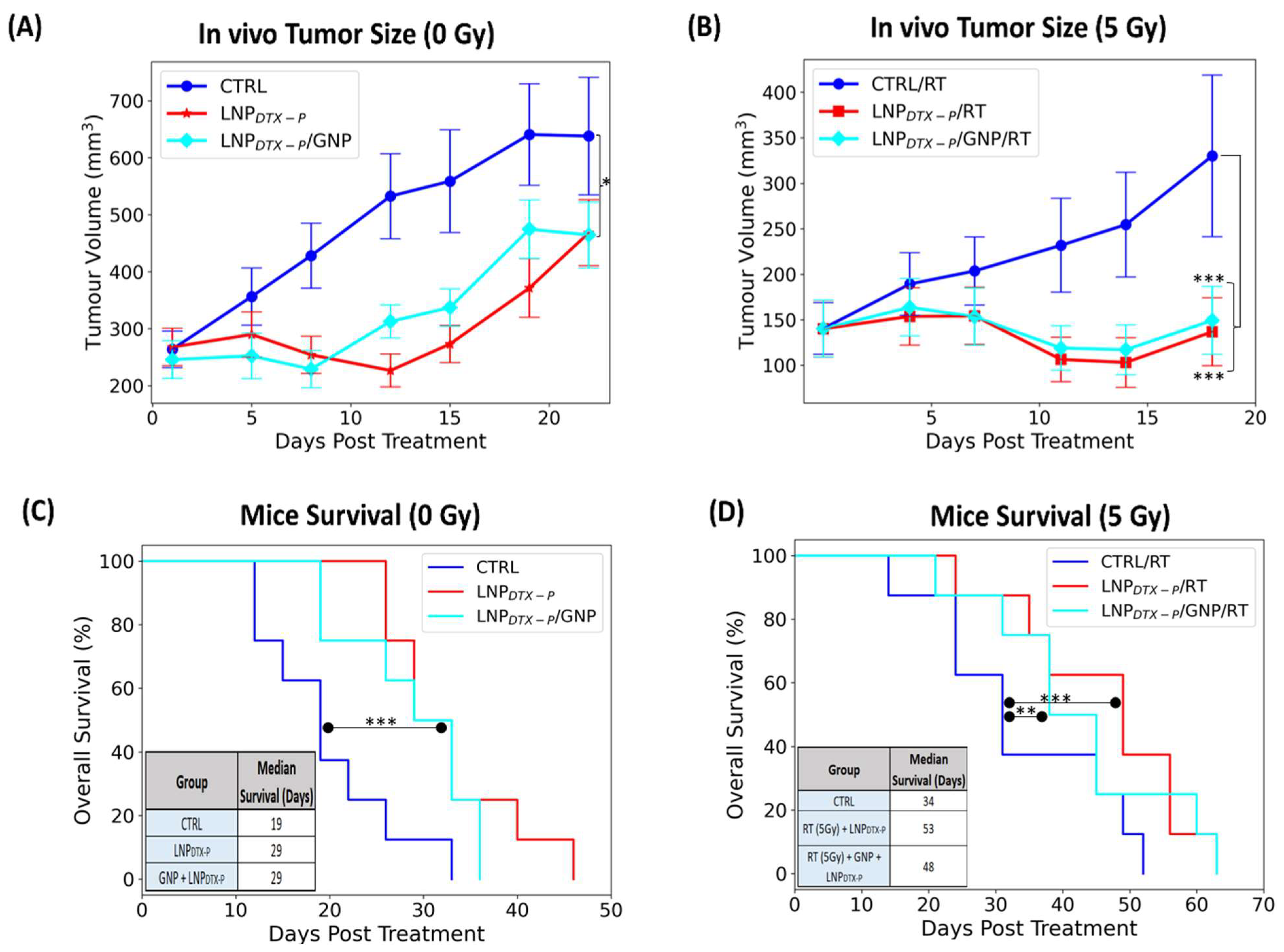 3.3. In Vivo Tumor Suppression and Survival Outcomes Following GNPs + LNPDTX–P + RT