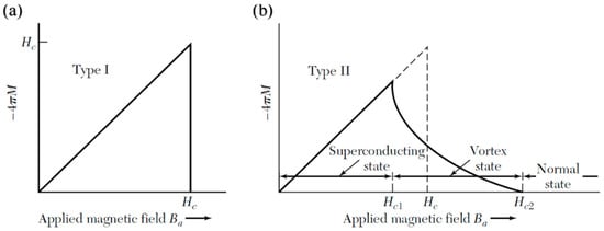 Magnetic response of type I (a) and type II (b) superconductors showing the critical fields Hc, Hc1, and Hc2. Reproduced from [35].