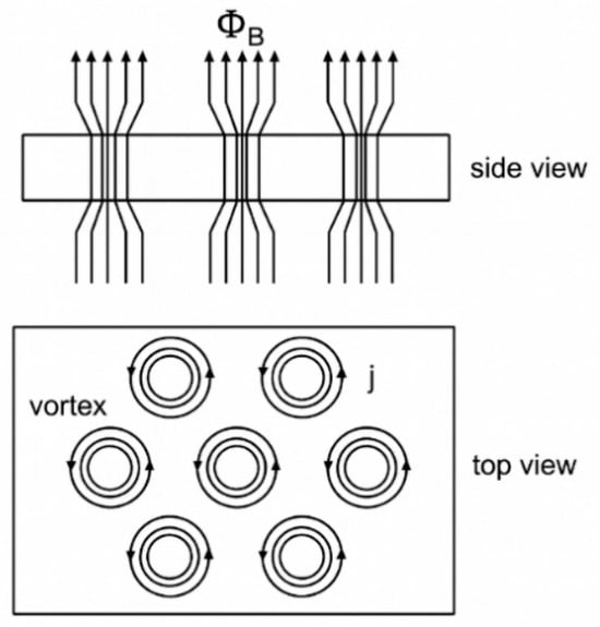 Superconductors are typically classified by their magnetic response. Type I superconductors (Figure 2a) exhibit the Meissner state until Hc is reached, above which they abruptly lose superconductivity and enter the normal conducting state, even if the temperature is still below Tc. In contrast, Type II superconductors (Figure 2b) possess two critical fields. Above the Hc1, they enter an intermediate or mixed state where magnetic flux enters the material in the form of quantised vortices, each carrying a single flux quantum. This was demonstrated experimentally in 1961 by Deaver and Fairbank [34]. These vortices consist of normal-conducting vortex cores surrounded by circulating supercurrents that confine the magnetic field locally, allowing the material to maintain zero DC resistance, as shown in Figure 3, and they are usually pinned at defects or impurities within the material. As the applied field increases, the number of vortices grows until they overlap at the upper critical field (Hc2), beyond which superconductivity is destroyed. A very stable mixed states make Type II superconductors a very valuable material for high-field applications, including SRF cavities [31].