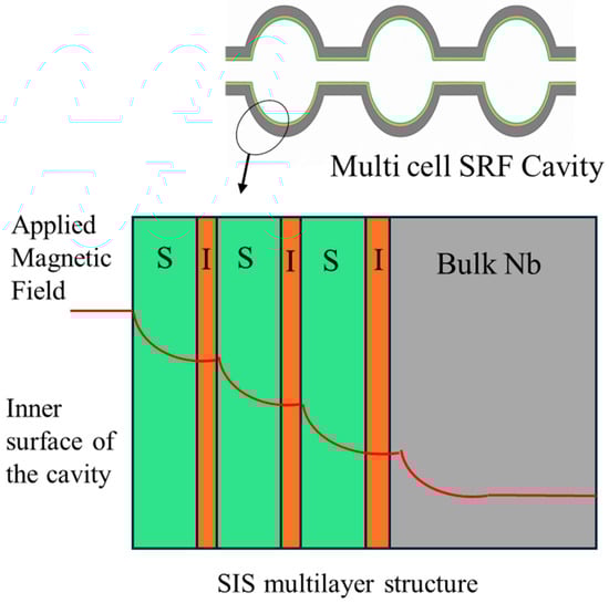 One potential mechanism to improve the performance of superconductor materials beyond the bulk limits of Nb is through a Superconductor–Insulator–Superconductor (SIS) multilayer system, first proposed by Gurevich. In an SIS structure, the Nb substrate is coated with alternating thin insulating (I) and superconducting (S) layers; the outer S layer has a higher Tc and larger superconducting gap, such as Nb3Sn, NbN or NbTiN. Advantages of a multilayer structure include improved magnetic screening and less RF surface resistance: thin superconducting layers with thicknesses less than their penetration depth (λ) suppress flux entry and increase the effective superheating field, allowing operation beyond Nb’s intrinsic limit of ~200 mT. Additionally, these high-Tc superconductors reduce the BCS surface resistance, especially at 4.2 K, allowing for larger cryogenic savings. Insulating layers decouple neighbouring superconducting films, reduce the Josephson coupling, and can limit the vortex propagation across the multilayer stack, thereby delaying the magnetic flux penetration into the Nb substrate. Multilayers of NbN and NbTiN, which are deposited on a Nb substrate, have demonstrated enhanced Hc1 and lower surface resistances than bulk Nb. The main challenge is to develop an effective insulating layer (AlN or MgO) that is uniform, dense, and defect-free, which can effectively decouple the superconducting films without forming weak links and pinholes. Other dielectrics such as SiO2 and Al2O3 can also be used as insulating layers; however, most recent studies focus on AlN and MgO, which usually provide more uniform barriers. This preference may be related to pinholes or weak spots that have been reported in some oxide barriers [44]. A schematic of the SIS idea is shown in Figure 4.