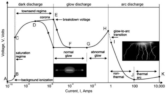The generation of plasma is the primary step in sputtering, which can be interpreted via the voltage–current characteristics of electrical discharges, as shown in Figure 5. Sputtering begins with the introduction of a neutral process gas, such as argon or krypton, into the chamber. Once an electric field is applied, free electrons are accelerated, leading to collisions that ionise the gas (Townsend discharge). These ions accelerate towards the cathode surface and bombard it, ejecting target atoms and releasing secondary electrons that sustain the discharge. Once the breakdown takes place, the plasma establishes in the normal glow regime, a stable plasma condition where processes yield a visible light emission due to electron–ion recombination. As the electrical potential (applied field) is increased, the discharge enters the abnormal glow regime where carrier densities (1015–1019 m−3) are sufficiently high to sustain sputtering. On further increasing the field, the discharge transitions into arc mode, where significant current densities and target material degradation occur, as this condition is unsuitable for thin-film deposition.