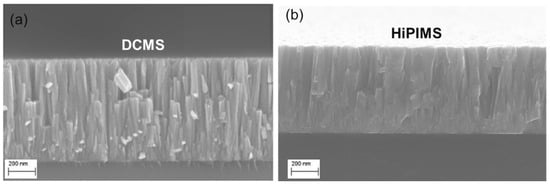 Cross-sectional SEM comparison of NbTiN films deposited by (a) DCMS and (b) HiPIMS. Reproduced from [65].