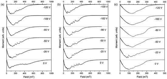 DC magnetic moment versus applied magnetic field at 4.2 K for Nb thin films deposited at (a) room temperature, (b) 500 °C, and (c) 700 °C under different substrate biases. Reproduced from [67].