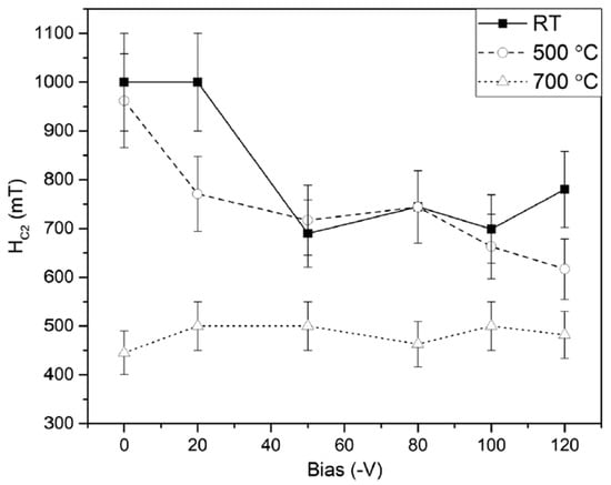 Upper critical field (Hc2) of Nb thin films as a function of substrate temperature and applied bias. Reproduced from [67].