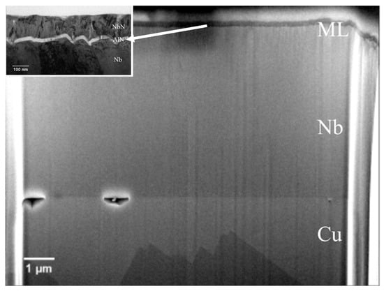 In a comprehensive parameter study systematically varying bias, duty cycle and temperature during the HiPIMS depositions on electropolished copper, it was confirmed that the films with lattice parameters similar to that of the bulk and with large crystallite sizes have the highest Tc (~9.3 K average, up to peaks of 9.6–9.7 K) when applying high substrate bias (≥−150 V) and relatively high substrate temperatures (~290 °C) [68]. In another related study, the same authors developed multilayer Nb/AlN/NbN SIS structures, with the Nb base layers achieving Tc ≈ 9.4 K and Hen ≈ 52 mT alone, with multilayers providing a further improvement to Hen of 64.5 mT. From the FIB–SEM cross sections (Figure 10), it can be seen that interfacial voids and partial delamination at the Cu/Nb interface, indicating that even with SIS multilayers, the quality of the Nb base layer can still limit performance [69].