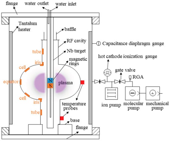 Schematic of the HiPIMS deposition system for coating 1.3 GHz Cu cavities. Reproduced from Duan et al. [74].