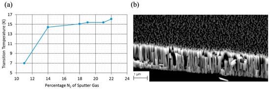 (a) Transition temperature of NbN thin films as a function of N2 partial pressure (substrate at 385 °C). (b) SEM cross-section of an NbN thin film (385 °C, 22% N2). Reproduced from [79].