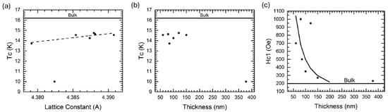 Complementary studies showed that the superconducting properties of NbN are very sensitive to stoichiometry. NbN films were deposited at room temperature by reactive DCMS on SiO2 with an N2 fraction of 0.5–30%, and a 50 V rf substrate bias. The films exhibited nearly stoichiometric δ-NbN (RN2 = 8–16%) with a Tc ≈ 12.8–13.2 K and a Hc2 (0) ≈ 28–30 T. N-deficient films (1–2%N2) exhibited highly suppressed Tc ≈ 2.5 K, while N-rich films (≥20% N2) exhibited degraded Tc ≈ 6–7 K. The films were non-superconducting at ~30% N2. Both deficiency and excess N2 caused higher resistivity and lowered Tc. This implies that good superconducting properties at room temperature, as well as elsewhere, require controlled stoichiometry [80]. To determine if NbN could serve as a direct coating material for SRF cavities, Leith et al. deposited NbN on polycrystalline Cu substrates using reactive DCMS and evaluated different pressures and N2 flow rates. At 6 × 10−3 mbar and a N2 fraction of ~8%, a δ-NbN (200) phase was obtained with a Tc ≈ 12 K and Hen ≈ 13 mT, and the microstructure was dense, with no apparent voids. At 1.4 × 10−2 mbar, δ-NbN(111) was the predominant phase with a high Tc of up to 16.1 K, but low Hen ≈ 5.0 mT due to the formation of faceted and discontinuous growth. Excess N2 (>15) caused secondary phases, severely reducing both Tc and Hen [68]. Thus, there is a clear trade-off, as higher Tc can be attained, but at the expense of the effectiveness of magnetic screening (Hen) from the porosity or other secondary phases. The impact of lattice parameters and film thickness on superconducting properties was studied by depositing epitaxial NbN films on MgO(100) via DCMS. A linear correlation was identified between Tc and lattice parameters, shown in Figure 14a. There was no noticeable dependence of Tc on thickness (Figure 14b). Hc1 has a significant thickness dependence, ~100 mT for an 80 nm film compared to ~20 mT for bulk NbN (Figure 14c). Therefore, it is necessary to control the sub-penetration-depth thickness for multilayer applications [81].