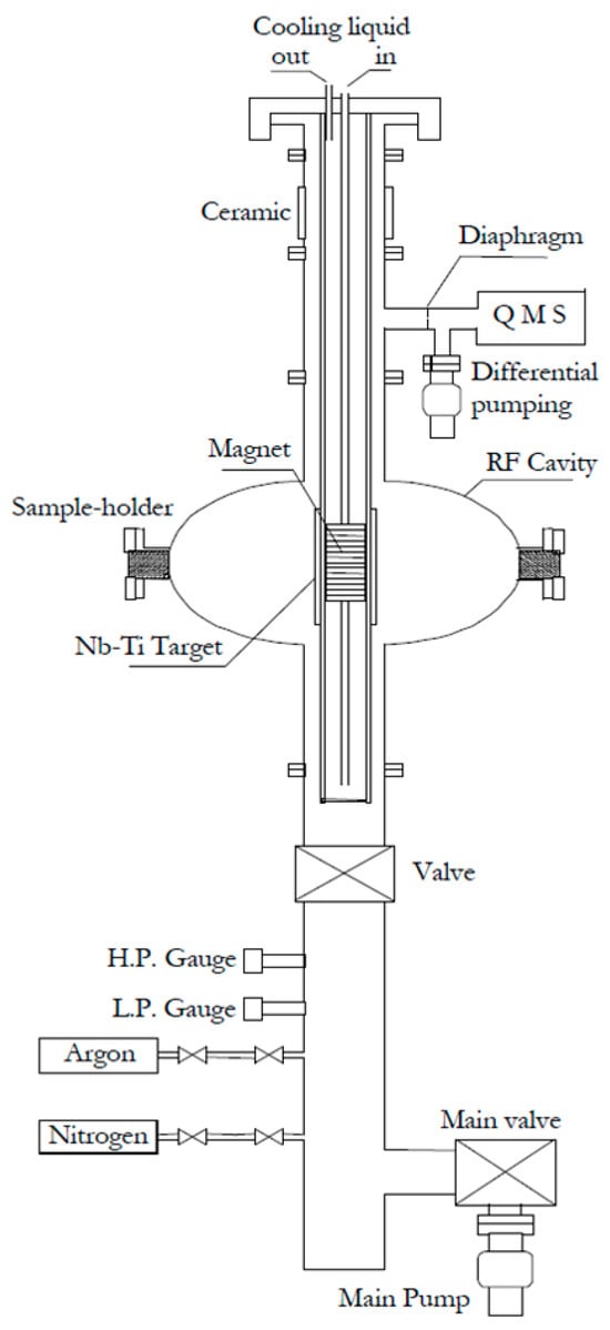 The sputtering system for the deposition of NbTiN thin films inside 1.5 GHz resonators. Reproduced from [84].