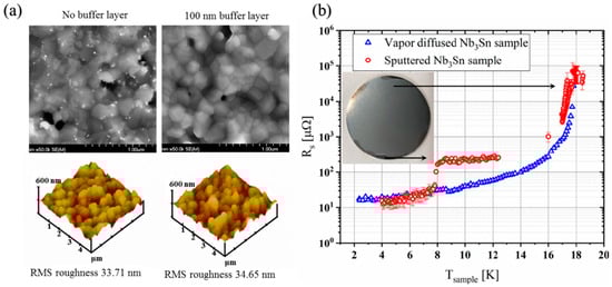 Initial efforts used multilayer sputtering followed by annealing to form Nb3Sn. Nb/Sn multilayers were deposited at 3 mTorr using a Nb (DC) and Sn (RF) target and subsequently annealed at 1200 °C for 3 h, resulting in crystalline, uniform, void-free Nb3Sn with Tc as high as 17.6 K. Phase formation was closely correlated with the Nb-to-Sn layer thickness ratios with thinner stacks (~2) producing phase pure Nb3Sn layers while thicker stacks (~4.5) produced secondary Nb6Sn5 phases. Sn deficiency after annealing has remained an issue [90]. The multilayer strategy was further optimised by the addition of Nb buffer layers (0 to 100 nm) below stacks of Nb (20 nm) and Sn (10 nm) (total ~1.5 µm). After annealing at 950 °C for 3 h, uniform grain growth was observed, with surface roughness between 23 and 34 nm (Figure 16a). All coatings exhibited Tc ≈ 17.75–17.82 K with narrow transitions, of RRR ≈ 4.3–4.7, and surface resistances similar to films from vapour-diffused films (Figure 16b) [91].