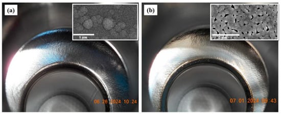 Surface of the coated Nb cavity: (a) as deposited and (b) after sequential annealing at 600 °C for 6 h followed by 950 °C for 1 h. Insets show corresponding SEM micrographs of the surface morphology. Reproduced from [94].