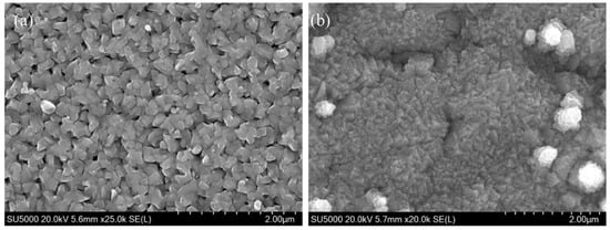 The HiPIMS films are demonstrated to have far greater density and crystallinity than the DCMS films, with much lower void content and superior adhesion. The main concern with HiPIMS is the lower deposition rate, especially at low duty cycles, as well as the greater complexity of the system. However, there are some applications, particularly superconducting coatings like Nb, NbN, and NbTiN, where HiPIMS performance has been extremely useful, especially where dense, defect-free coatings with bulk-like lattice parameters are needed to minimise RF losses and suppress the Q-slope. The benefits of HiPIMS technology are illustrated in Figure 7, which compares the NbTiN thin films deposited at the same pressure (1.8 Pa) by DCMS and HiPIMS. The morphology of the DCMS film is porous, columnar, and features internal voids, with a relatively low Tc (~11.8 K). HiPIMS film, on the other hand, was dense and uniform and provided a distinctly higher Tc (~13.7 K), which directly relates microstructure to superconducting performance. This shows the advantage of HiPIMS to potentially mitigate the limitations of traditional sputtering for SRF cavity coatings [47,49,64].