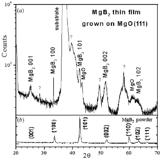 - Ermolov, S.N.; Indenbom, M.V.; Rossolenko, A.N.; Bdikin, I.K.; Uspenskaya, L.S.; Stepakov, N.S.; Glebovskii, V.G. Superconducting MgB2 films obtained by magnetron sputtering. Jetp Lett. 2001, 73, 557–561. [Google Scholar] [CrossRef]