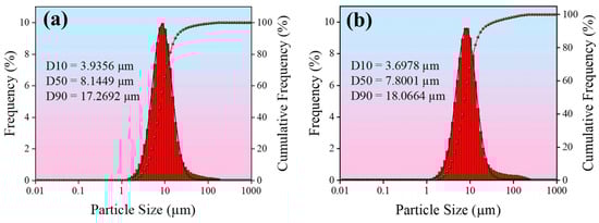 In this study, electrodeposition was carried out using a double-pulse power supply (Shanghai, China) with a high-purity silver plate (purity ≥ 99.9%) as the anode and a pre-treated copper violet substrate as the cathode. The electrodeposition was carried out in a standard glass beaker with a cathode-anode spacing of 5–7 cm, and the temperature of the plating solution was maintained at 30 °C. The stirring speed was controlled at 260 rpm using a collector-type thermostatically heated magnetic stirrer (Gongyi, China). The plating solution composition and plating parameters of the four coatings prepared in this study are shown in Table 1, of which, #1 represents a pure silver coating obtained via direct current electroplating using a pure silver plating solution, serving as the control group; #2 and #3 coatings were prepared using direct current electroplating with silver graphene (Ag-G) and silver oxide graphene (Ag-GO) plating solutions at a concentration of 0.75 g/L, respectively; #4 The coating was prepared using an optimized dual-pulse electroplating process based on a 0.75 g/L Ag-GO plating solution. Figure 1 shows the particle size distribution of G and GO in the plating solutions. The median diameters of both are relatively close, consistent with the parameters of the aforementioned G and GO powders. In comparison, GO exhibits slightly smaller particle sizes, resulting in better dispersion.