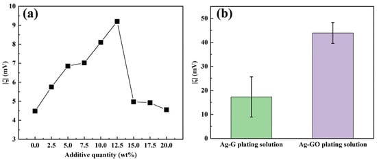 (a) The relationship between the |ζ| value and the amount of SDS added; (b) |ζ| values in Ag-G and Ag-GO composite electroplating solutions.