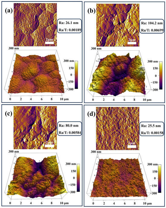The surface roughness of conductive plating layers is a key factor affecting their performance. Lower roughness enables more uniform current distribution, enhancing conductivity and wear resistance, while also being critical to the performance and reliability of microelectronic devices. The preparation method decisively influences roughness. Compared to direct current plating, pulse plating techniques—such as dual-pulse plating—effectively suppress dendrite formation by precisely controlling nucleation and growth, yielding denser, flatter coatings [40]. The microstructural characterization of the coating in this study was initially performed using AFM for the quantitative analysis of surface morphology and roughness (Ra). Figure 3 shows the surface morphology of four different coatings and their Ra values, and the surface differences and roughness variations in each coating can be clearly observed from the 3D reconstruction of AFM. Coating #1 (Figure 3a) has a flat and dense surface with an Ra value of 26.1 nm, with little surface undulation and small height variation in the region. Coating #2 (Figure 3b) has a rough surface with an Ra value of 104.2 nm, with obvious peaks and valleys structure and uneven surface. This inhomogeneous surface topography originates from the phenomenon of abnormal grain growth or particle agglomeration due to the agglomeration of G during the deposition process, which can lead to the degradation of coating mechanical properties and corrosion resistance. Coating #3 (Figure 3c) has an Ra value of 80.0 nm and a roughness between coatings #1 and #2, with a relatively uniform surface and reduced fluctuations. Coating #4 has the optimum surface flatness with an Ra value of 25.5 nm, slightly better than the coating #1. It has the smallest range of height variation and the fewest surface defects. Additionally, for conductive coatings, surface flatness typically exhibits a positive correlation with performance. A lower ratio of roughness to thickness (Ra/T) indicates a smoother coating surface. As shown in the data, all four coatings exhibit relatively low ratios, with coating #4 displaying the smallest value, indicating its optimal surface flatness.