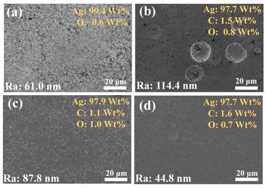 Subsequently, this study used SEM equipped with EDS to characterize the morphology of the coating. As seen from the SEM image (Figure 4), the #1 coating has holes on the surface and is not structurally dense. Large silver particles are distributed on the surface of #2 coating, resulting in a significantly higher roughness than the other coatings, which is due to the abnormal growth of silver particles caused by G agglomeration and uneven distribution. The surface of the #3 coating has no obvious silver particles, but there are still undulations and the surface flatness needs to be improved. In contrast, the #4 coating has a flat, dense surface with minimal roughness, demonstrating the significant effect of the optimized double-pulse electrodeposition process in improving the coating quality. According to the EDS analysis, carbon elements were not identified in the #1 coating, while C elements were present on the surfaces of the #2, #3, and #4 coatings, which proves the successful introduction of G into the coatings. In particular, the O-element content of the #2 coating is close to that of the #3 and #4 coatings, which suggests that the oxygen-containing functional groups of GO were partially removed in the strongly alkaline plating environment and electrodeposition process, and thus reduced to G with fewer defects and introduced into the coating [41,42].