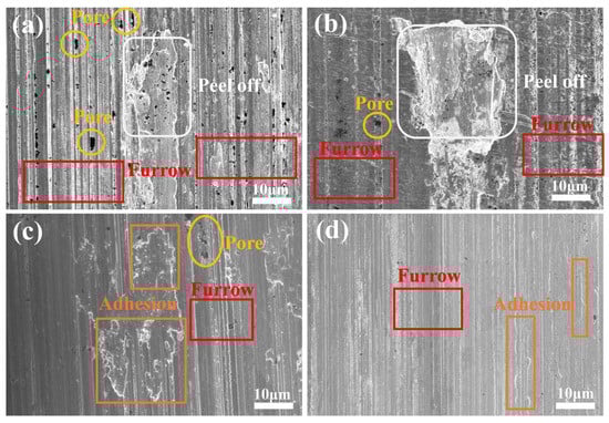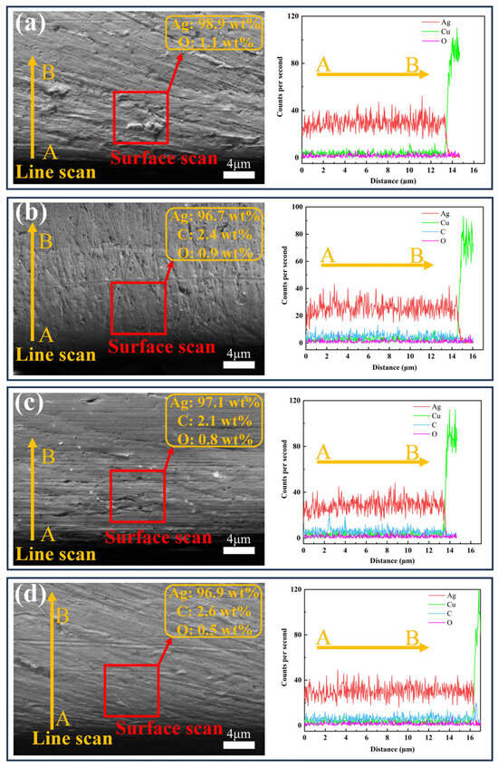 Figure 11 illustrates the SEM images of the abrasion marks of the four coatings after the current-carrying friction experiments. The abrasion marks of the #1 coating show severe furrows and extensive peeling, which indicates that significant abrasive wear has occurred. Due to the softness of the sterling silver material, it is prone to material spalling, and the spalled material acts as abrasive particles in friction, further aggravating the wear. In addition, the abrasion marks are densely distributed with holes, indicating that material loss occurred during friction as a result of arc erosion. Areas of porosity, peeling, and furrowing were present in the wear marks of coating #2, the number of pores was reduced compared to coating #1, but localized peeling was present. The peeling areas were more pronounced and deeper, suggesting that the addition of G improved the material hardness but resulted in deeper wear marks due to the uneven distribution, leading to localized stress concentrations. The wear marks of the #3 coating contain only a small number of holes and shallow furrows, with a significant reduction in the number of pores, but adhesive wear occurs. This suggests that the uniform distribution of G inhibited material loss and interfacial failure, but large patches of adhesive wear still occurred due to the poor reduction in G. The abrasion marks of the #4 coating showed only a small amount of shallow furrowing and adhesion areas with the surface. This indicates that the pulsed process further optimized the reduction and distribution of G, which significantly improved the wear resistance and interfacial stability of the material. The localized adhesion areas may be due to the lubricating film formed by G during the friction process, which resists the erosive effect of the arc and further reduces the coefficient of friction and wear rate.
