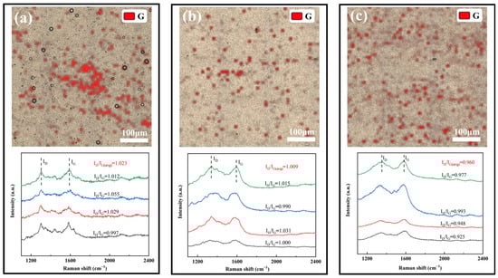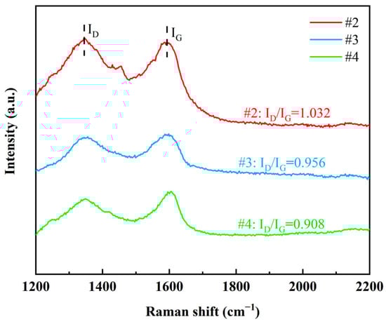 In order to verify whether G is effectively embedded inside the coatings, Raman spectroscopy was performed in this study on the cross-sections of the three coatings #2, #3, and #4 (Figure 7). The results showed that the D peak (~1350 cm−1) and G peak (~1580 cm−1) were detected for all three coating cross-sections, indicating that the characteristic structure of G was preserved inside the coating, and the embedding of G in the metal matrix was successfully realized. By quantitatively analyzing the ID/IG values, it was found that the #2 coating had the highest ID/IG value, indicating that the non-covalently modified G suffered from large structural damage during the embedding process and the presence of agglomeration phenomenon, which led to its high defect density. In contrast, the lower ID/IG value for coating #3 indicates that GO undergoes a reduction reaction during the electrodeposition process and is embedded in the coating with a lower defect density. The lowest ID/IG value for the #4 coating demonstrates that the double-pulse electrodeposition process significantly improves the degree of reduction and distribution uniformity of GO, resulting in a higher quality of G with fewer defects. In summary, the double-pulse electrodeposition process demonstrated obvious advantages in enhancing the dispersion, reduction degree and structural integrity of G.
