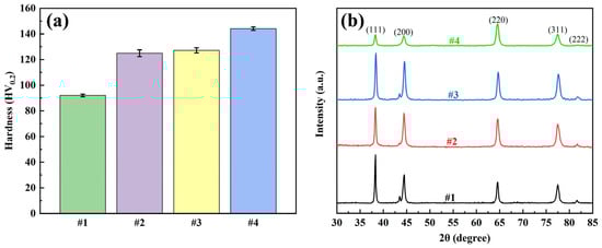 The mechanical properties of the coatings were evaluated by microhardness and XRD tests, and the results are shown in Figure 8. The hardness test showed that the microhardness of the #1 coating was 92.0 HV0.2, and the microhardness of the #2 coating was enhanced to 124.9 HV0.2, but the agglomeration and inhomogeneous distribution of G limited the performance enhancement. The microhardness of the #3 coating was slightly higher at 127.2 HV0.2, while the microhardness of the #4 coating using the double-pulse process was significantly increased to 144.1 HV0.2. This enhancement is mainly attributed to the homogeneous dispersion of GO in the plating solution, where the double-pulse electric field promotes the reduction in GO and its uniform distribution into the coating. The introduction of G enhances the strength of the composite coating and promotes grain refinement by hindering silver grain growth and providing more nucleation sites for silver ions.