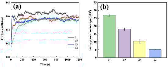 Dry friction tests were conducted on four coatings using UMT, and the morphology of the wear points was measured using a white-light interferometric three-dimensional topography scanner. The volume of the wear traces was calculated, and the results are shown in Figure 9. The friction coefficient test shows that the #1 coating has the highest friction coefficient (0.626) and fluctuates a lot, which shows poor friction performance; the friction coefficient of the #2 coating decreases after the addition of G but the friction curve still fluctuates a lot due to the uneven distribution of G; the friction coefficient of coating #3 is similar to that of coating #2, but it is more stable. This is due to improved uniformity of G distribution, but the friction coefficient remains high because the reduction degree of G is still insufficient; Coating #4 has the lowest and most stable coefficient of friction, indicating that the dual-pulse process effectively improves the thinning degree and uniformity of G distribution. Wear volume test results show that coating #4 has the smallest wear volume, 80.9% smaller than coating #1, proving its excellent wear resistance.