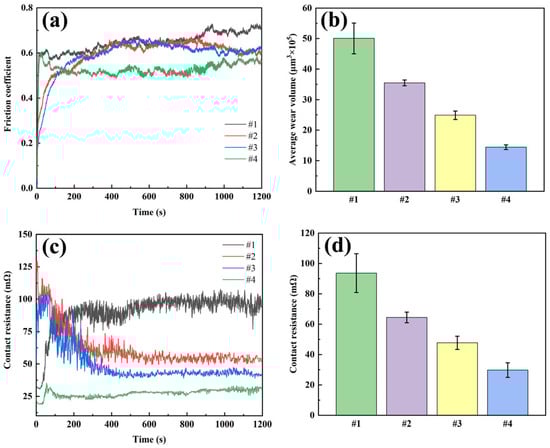 Current-carrying friction test results of four coatings: (a) friction curve; (b) average wear volume; (c) contact resistance curve; (d) average contact resistance.