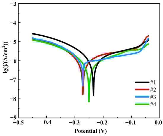 As can be seen in Table 5, coating #4 has the lowest corrosion current density and slowest corrosion rate, which is 45.5% lower than coating #1. In contrast, coating #1 had the highest corrosion current density and corrosion rate, indicating the worst corrosion resistance. The #2 and #3 coatings performed between the #1 and #4 coatings, with the #3 coating having a significantly lower corrosion current density and corrosion rate than the #2 coating due to the uniform distribution of G. This indicates that the double-pulse power process significantly improves the corrosion resistance of the coatings. This is mainly attributed to the following two reasons: firstly, the pulsed current promotes the uniform distribution and reduction in G, which enhances the densification of the coating and reduces the penetration path of the corrosive medium; secondly, the G is able to inhibit the corrosive reaction effectively by virtue of its high chemical stability and barrier properties to the corrosive medium. At the same time, the flatness and denseness of the coating surface structure reduces the anodic dissolution area and blocks the penetration of corrosive media. The coatings prepared by the double-pulse electrodeposition process show more excellent corrosion resistance due to the higher G content and better surface quality.