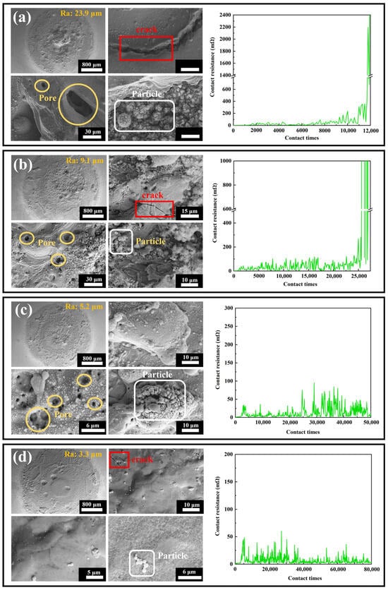 An electrical life test was conducted on an electrical contact material tester to evaluate the enhanced performance of the four coatings under actual working conditions. The contact resistance was monitored in real time during the experiments, and the change curve of contact resistance with the number of on–offs was plotted. The failure criterion of the coating is whether there is a sudden and large surge in contact resistance.