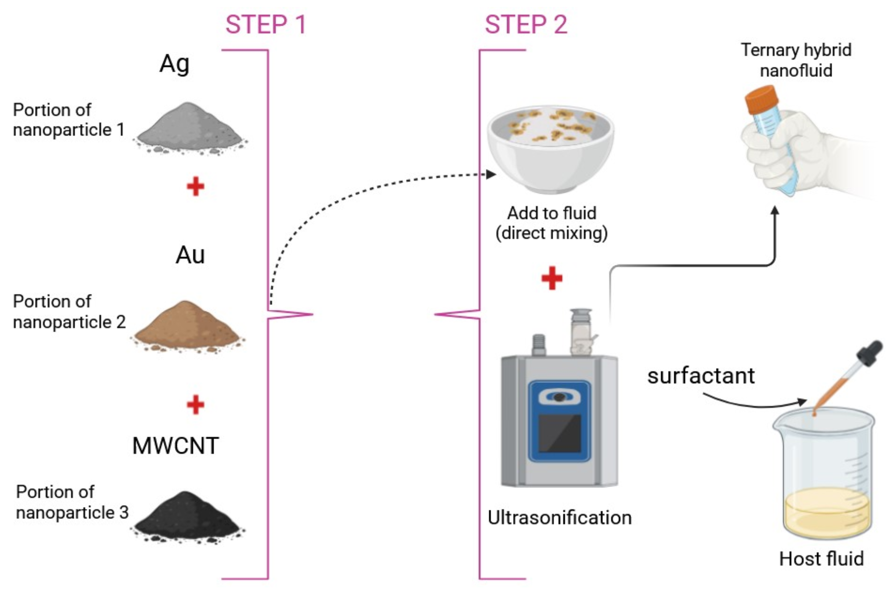 The theoretical research and synthesis procedure of the THNF is illustrated in Figure 2. Figure 3 shows the nanoparticles of the THNF, the factors under investigation, and their thermophysical properties. The effectiveness of the thermophysical models for THNF is demonstrated in [1].