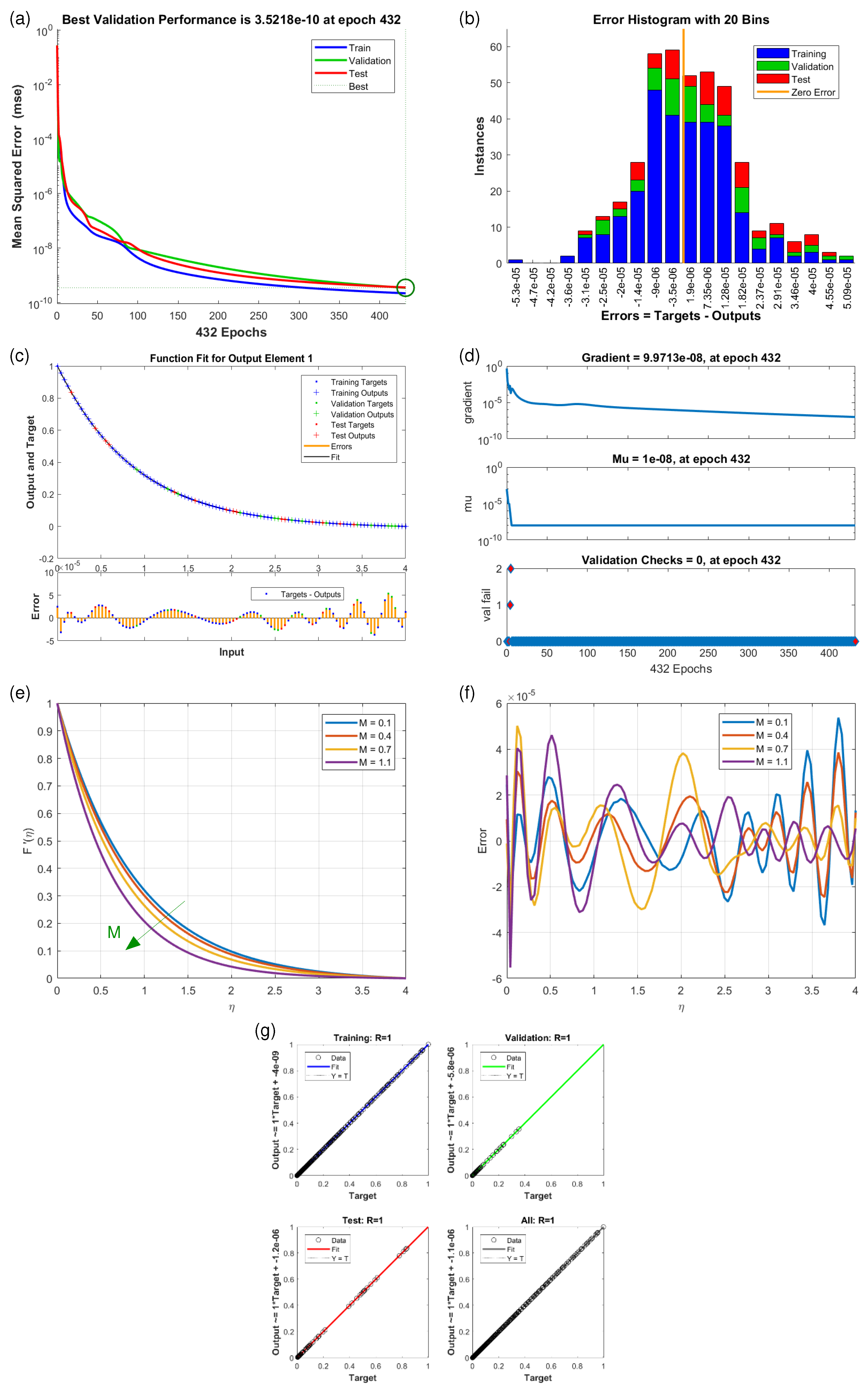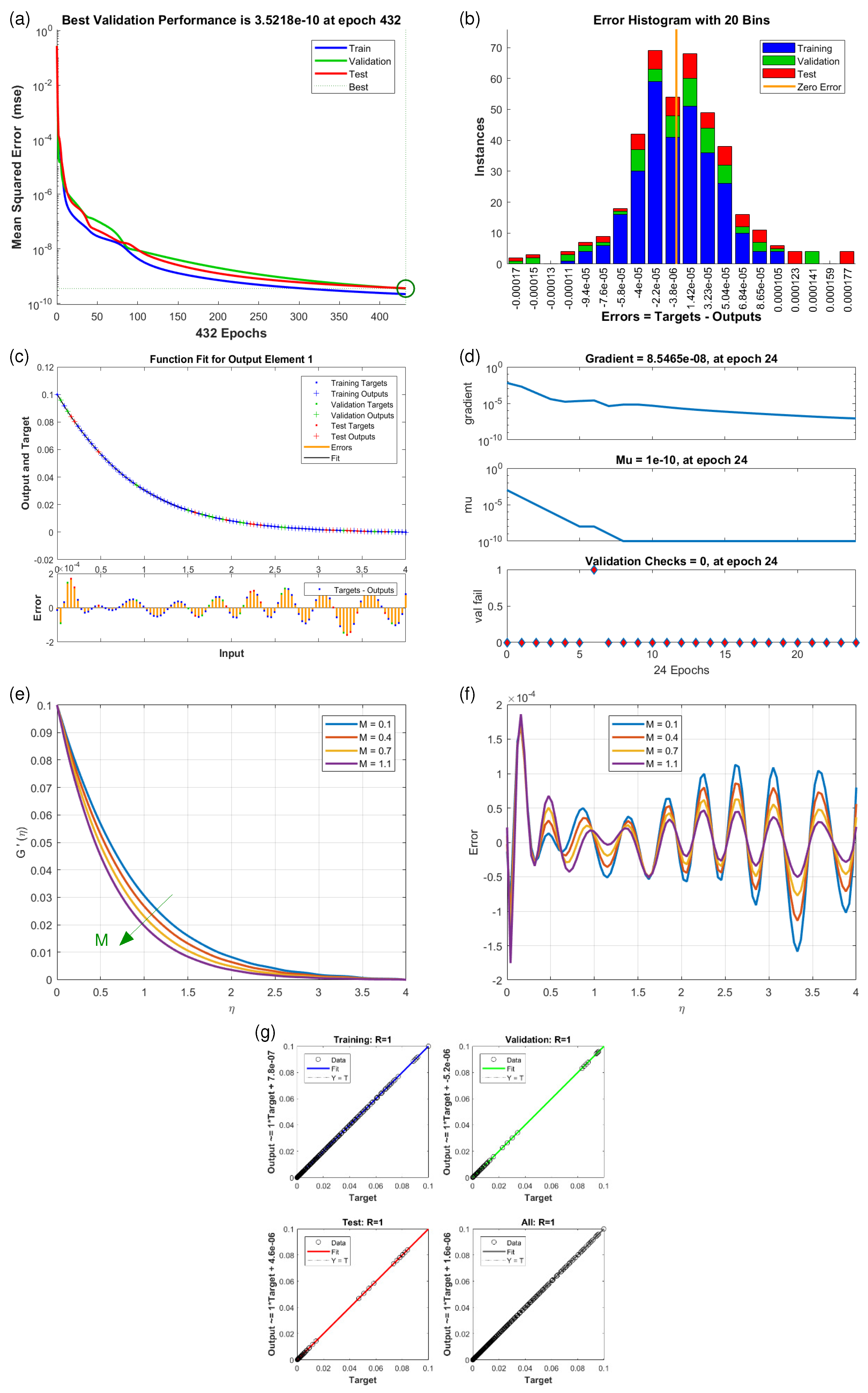 Figure 6. Results of horizontal velocity component F ( η ) for scenario S-1 (Table 3) with variation of Magnetic Parameter (M). Shown are (a) Performance state for F ( η ) ; (b) E.H for F ( η ) ; (c) Fitness state for F ( η ) ; (d) Training state for F ( η ) ; (e) Solution of THNF for F ( η ) ; (f) Error Profile of THNF for G ( η ) ; (g) Regression Analysis of THNF for F ( η ) .