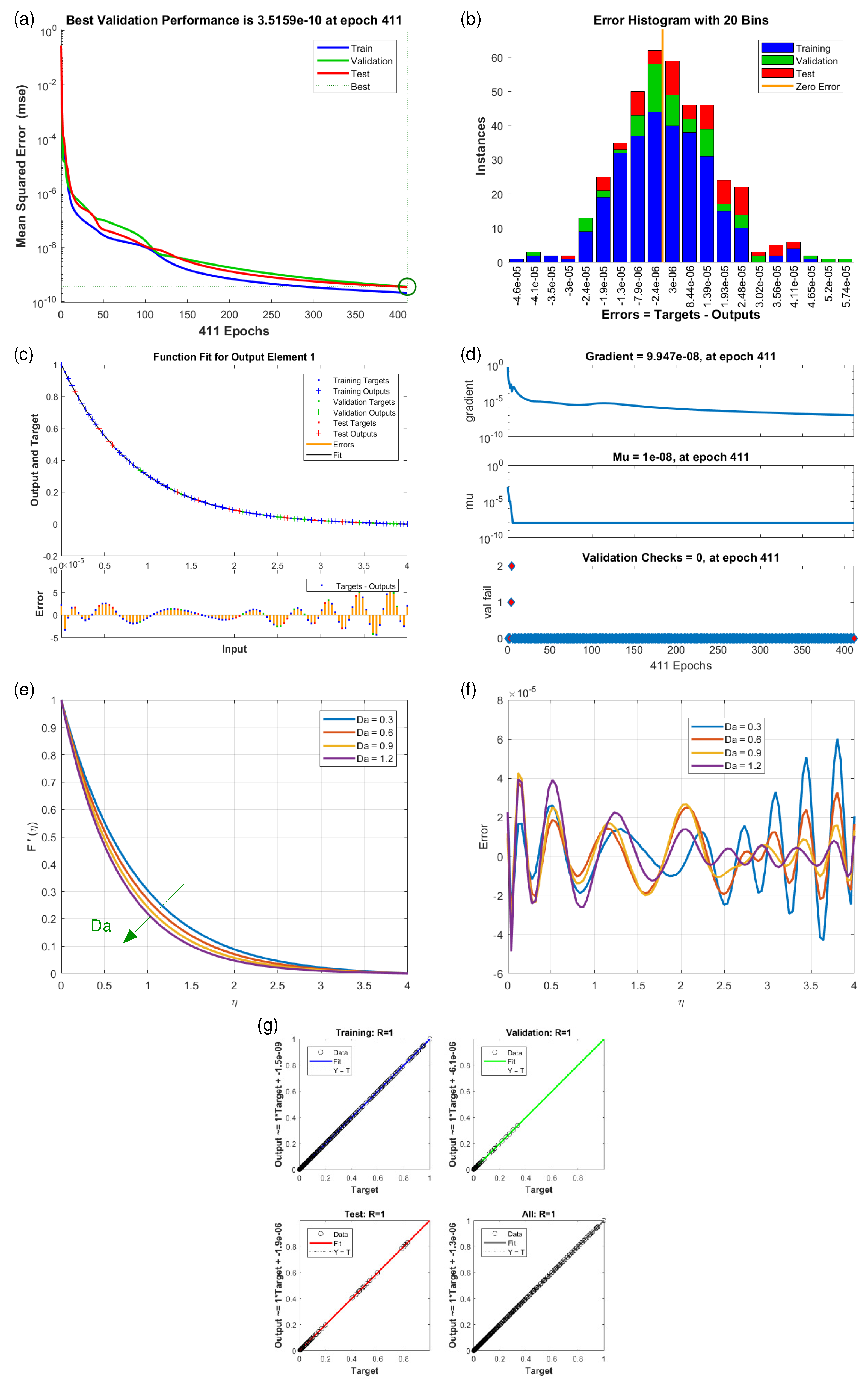 Figure 8. Results of horizontal velocity component F ( η ) for scenario S-3 (Table 3) with variation of Darcy Number ( D a ). Shown are (a) Performance state for F ( η ) ; (b) E.H for F ( η ) ; (c) Fitness state for F ( η ) ; (d) Training state for F ( η ) ; (e) Solution of THNF for G ( η ) ; (f) Error Profile of THNF for F ( η ) ; (g) Regression Analysis of THNF for F ( η ) .