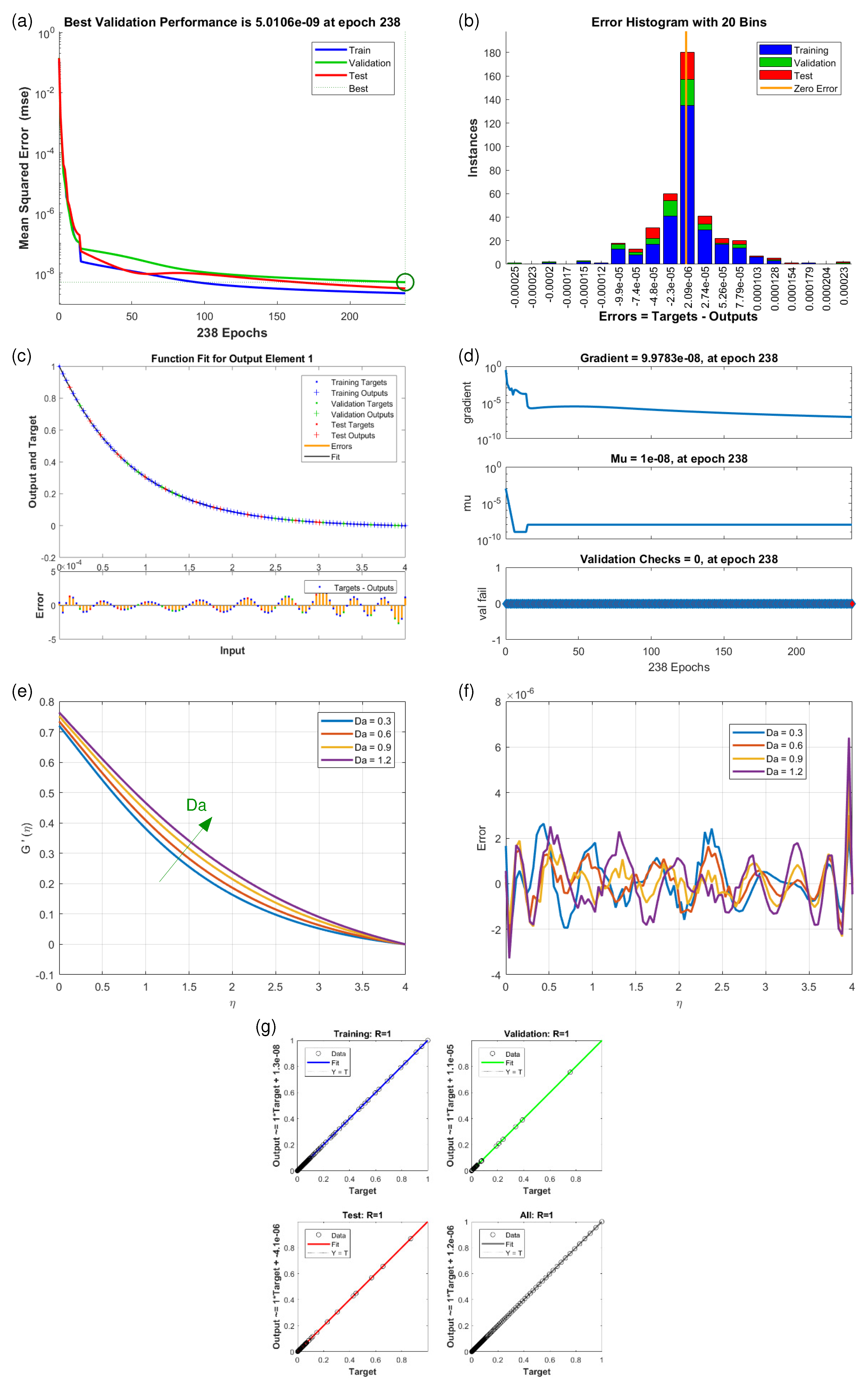 Figure 9. Results of vertical velocity component G ( η ) for scenario S-4 (Table 3) with variation of Darcy Number ( D a ). Shown are (a) Performance state for G ( η ) ; (b) E.H for G ( η ) ; (c) Fitness state for G ( η ) ; (d) Training state for G ( η ) ; (e) Solution of THNF for G ( η ) ; (f) Error Profile of THNF for G ( η ) ; (g) Regression Analysis of THNF for G ( η ) .