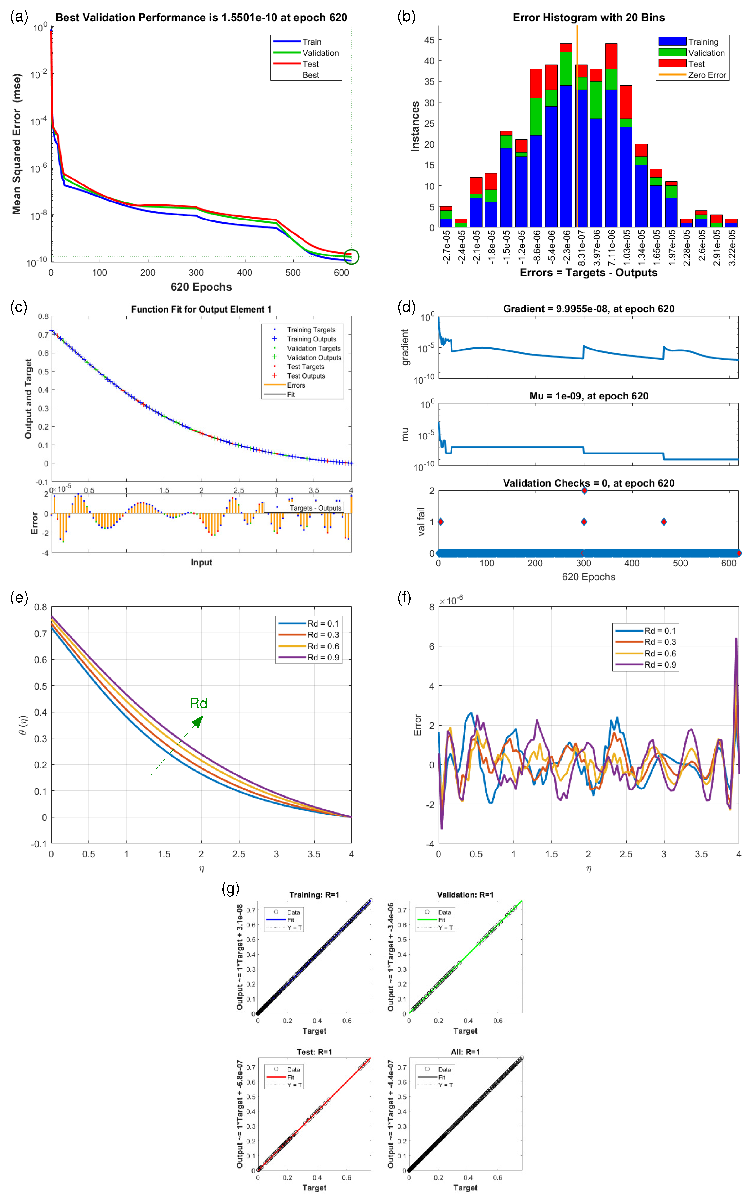Figure 12. Results of θ ( η ) for scenario S-7 (Table 3) with variation of Retardation factor ( R d ). Shown are (a) Performance state for θ ( η ) ; (b) E.H for θ ( η ) ; (c) Fitness state for θ ( η ) ; (d) Training state for θ ( η ) ; (e) Solution of THNF for θ ( η ) ; (f) Error Profile of THNF for θ ( η ) ; (g) Regression Analysis of THNF for θ ( η ) .