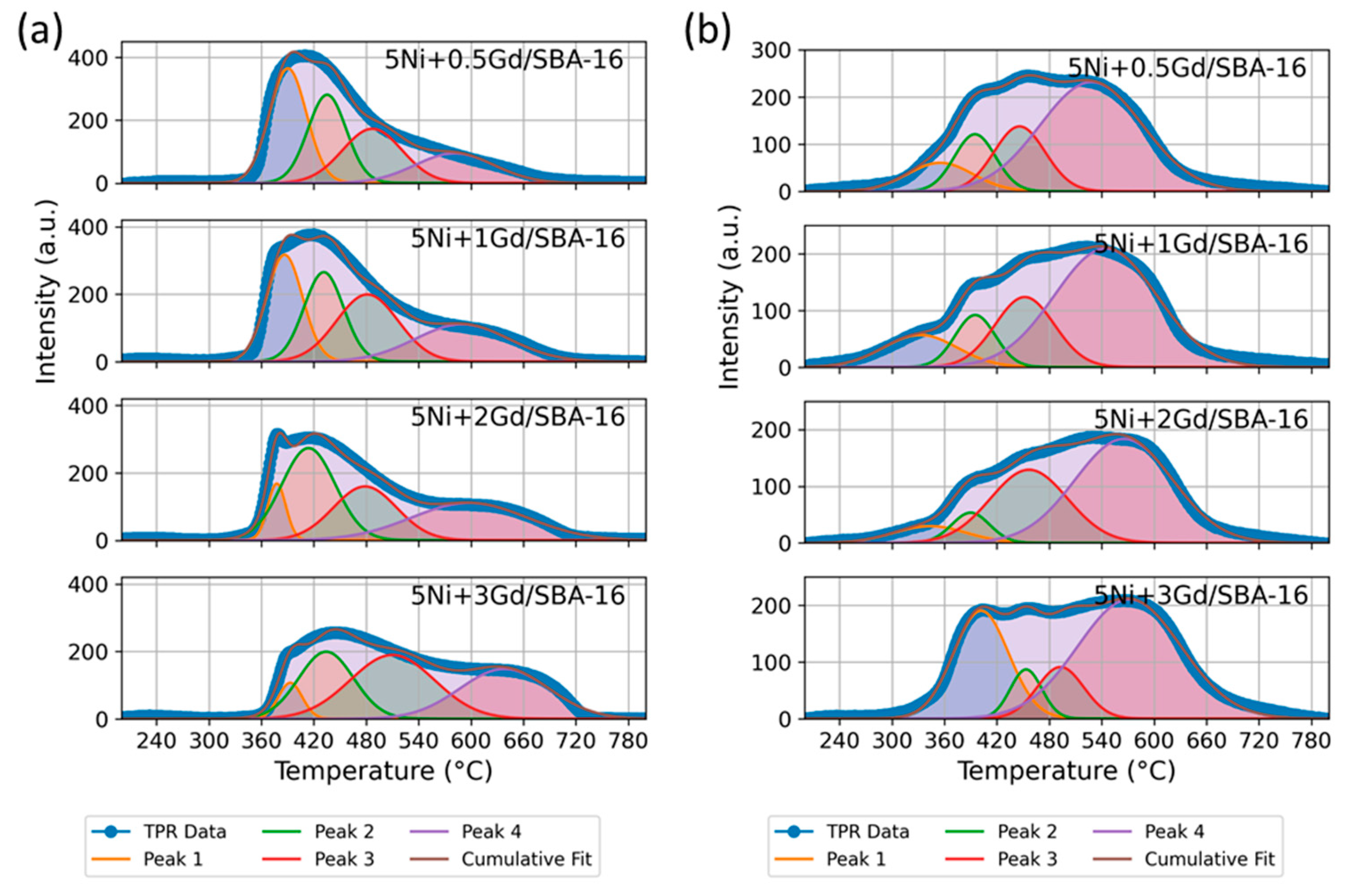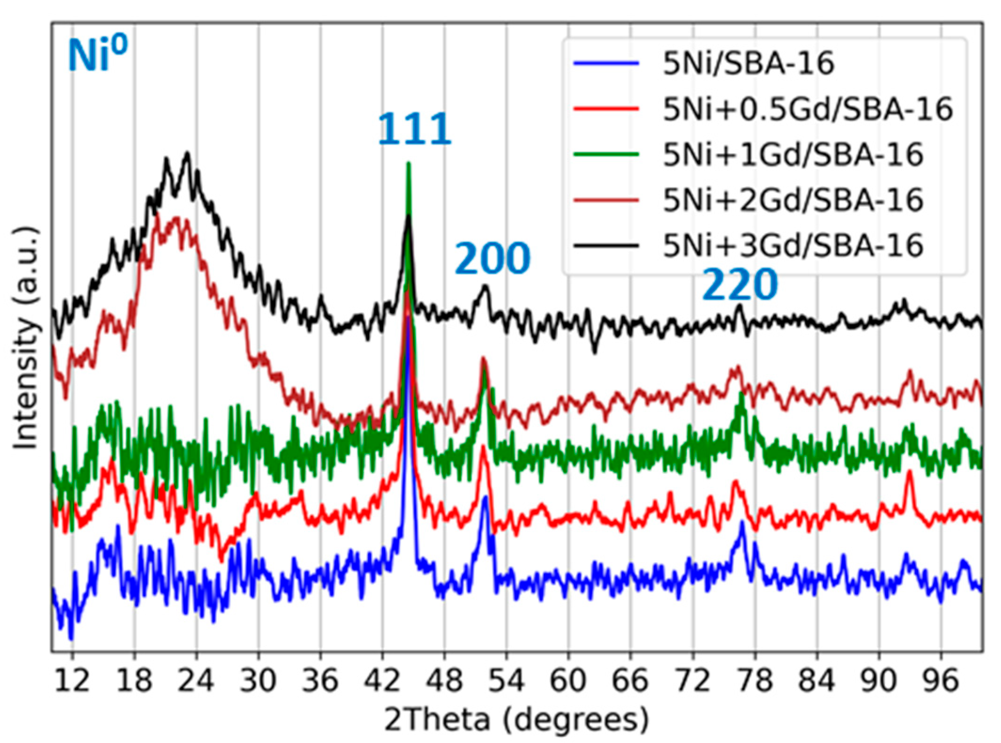 | Peak Assignment | Parameter | 5Ni/SBA-16 | 5Ni+0.5Gd/SBA-16 | 5Ni+1Gd/SBA-16 | 5Ni+2Gd/SBA-16 | 5Ni+3Gd/SBA-16 |