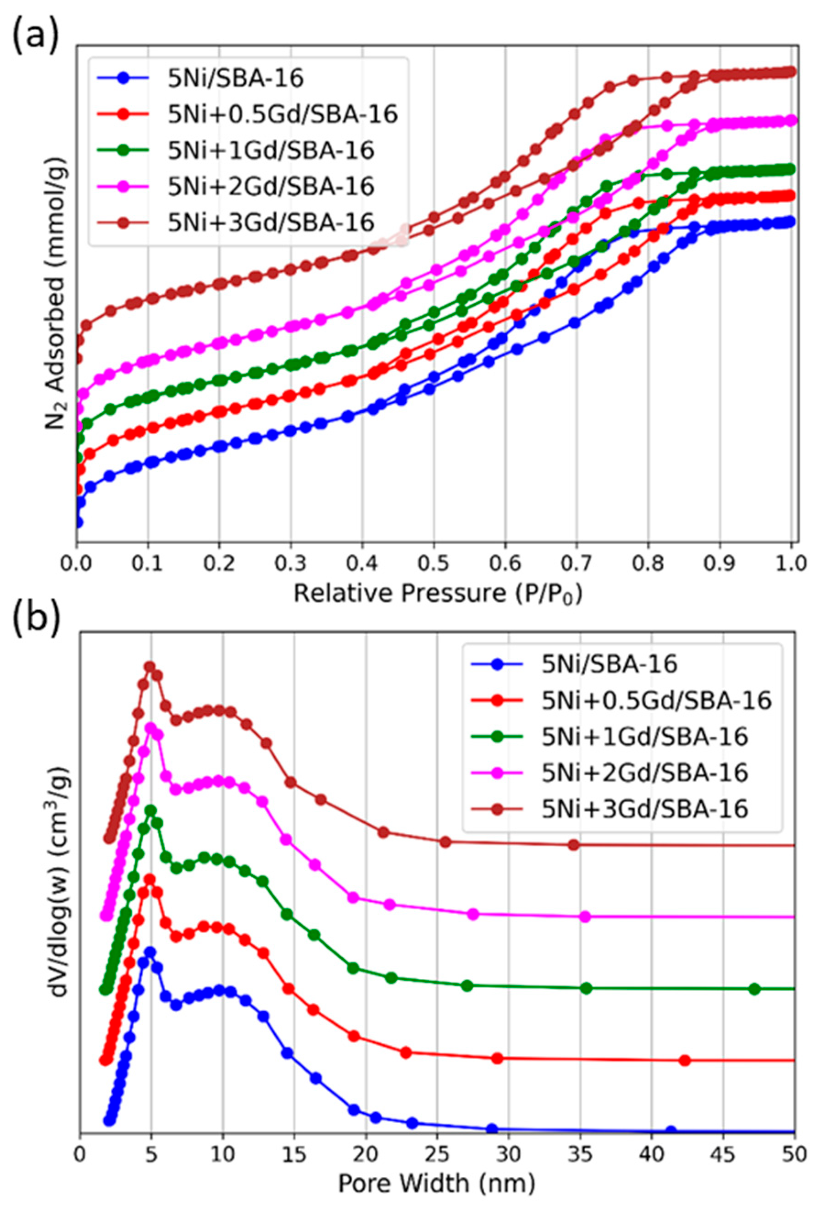 - Zhang, G.; Guo, H.; Zhao, L.; Wang, Y.; Li, J. Effect of Gd promoter on the structure and catalytic performance of mesoporous Ni/Al2O3–CeO2 in dry reforming of methane. Ind. Eng. Chem. Res. 2018, 57, 17076–17085. [Google Scholar] [CrossRef]